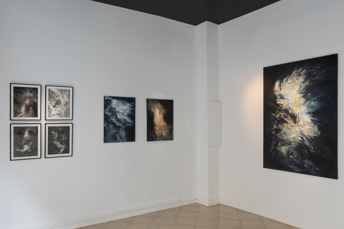 Mystique charnelle en errance, sidérante et somptueuse, allusive, possédée, et morsures de mort-vie en pleine peau-peinture. Des traces d’êtres, aux origines du monde, éclaboussent la nuit, comme des taches d’extrême vie. Dans les voiles de l’œuvre, dans ses replis de ténèbres, on voit tension étirée, densité de nuit, et saisissante présence de sources convulsives, venues soudainement du fond des âges. Ainsi s’ensacrent les flammes tendues des corps, sous le scalpel sans poids d’une lumière troublée, dans l’air raréfié des grands fleuves psychiques.